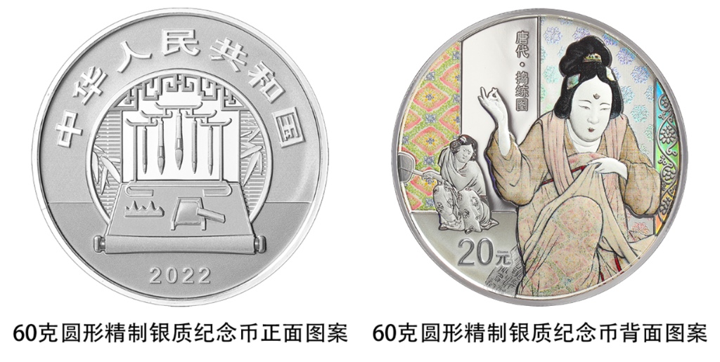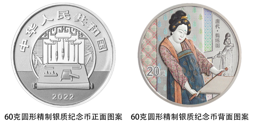 一枚60克圓形銀質(zhì)紀念幣背面圖案為《搗練圖》中縫紉、煽火造型,襯以裝飾紋樣組合設計,并刊“唐代·搗練圖”字樣及面額。