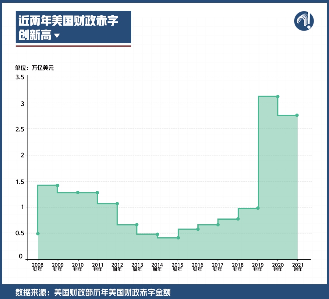 不僅如此,美國還多次出臺大規(guī)模經(jīng)濟紓困法案,2021年財政赤字率達(dá)到了12.4%,甚至已經(jīng)高于2009年金融危機期間9.8%的歷史最高水平。
