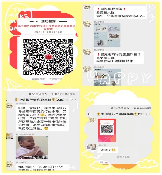 該行各網(wǎng)點組織開展“防范電信詐騙——中信銀行守護(hù)您的金融安全”主題線上沙龍活動,300余人積極參與,進(jìn)一步提高公眾金融素養(yǎng)。同時,該行充分利用線上宣傳渠道,通過專業(yè)人員講解、互動提問答題、電子宣傳手冊等方式,向社會公眾宣傳電信詐騙知識。并對學(xué)生、老年人等易受騙群體進(jìn)行針對性反詐警示教育,揭露電信詐騙犯罪手法和危害,以及教授如何識別、如何應(yīng)對、防止上當(dāng)受騙等方法。