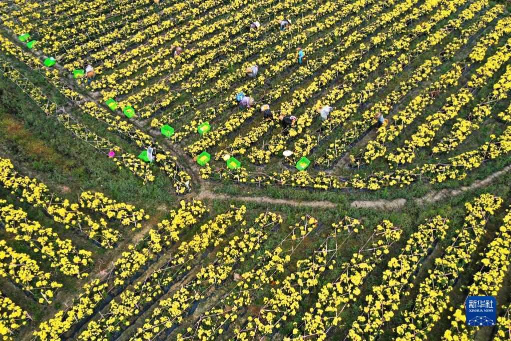 金秋時(shí)節(jié),貴州省黔南布依族苗族自治州貴定縣云霧鎮(zhèn)種植的1000余畝菊花陸續(xù)進(jìn)入采摘期,當(dāng)?shù)卮迕衩χ烧⒎謷?、烘干菊花,供?yīng)市場。