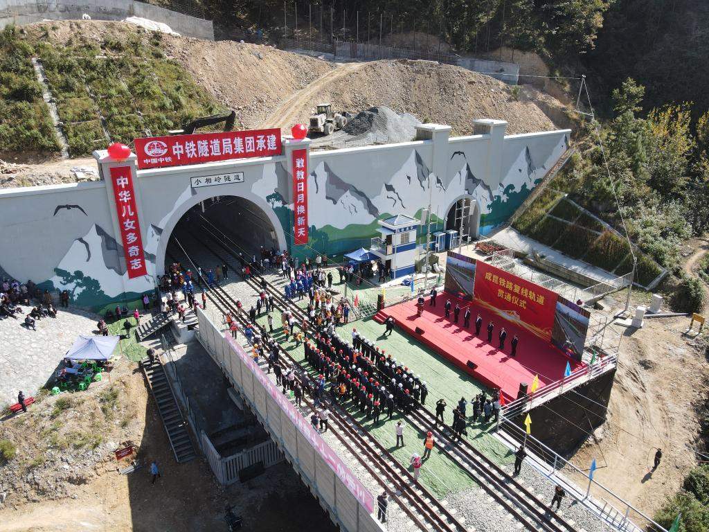 小相嶺隧道口的成昆鐵路復(fù)線軌道貫通儀式現(xiàn)場。(中國鐵路成都局集團公司供圖)
