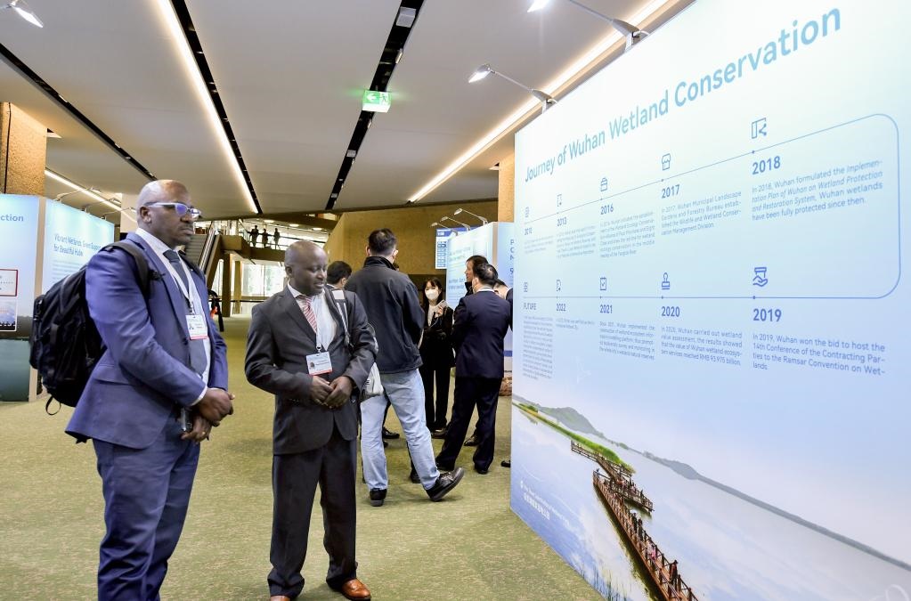 2022年11月5日,在瑞士日內(nèi)瓦,與會(huì)嘉賓在《濕地公約》第十四屆締約方大會(huì)日內(nèi)瓦會(huì)場中國展區(qū)參觀。新華社記者連漪攝