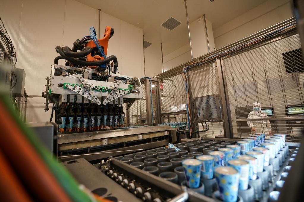 位于江蘇蘇州太倉的聯(lián)合利華和路雪生產(chǎn)基地,于2021年9月獲評(píng)全球“燈塔工廠”,成為當(dāng)?shù)亍爸悄苤圃臁钡臉?biāo)桿。工廠里,機(jī)器人正將產(chǎn)品轉(zhuǎn)移到速凍隧道。新華社記者 季春鵬 攝