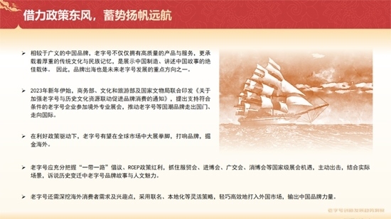 《報告》提到,在利好政策驅(qū)動下,老字號有望在全球市場中大展拳腳,打響品牌,掘金海外。具體來看,老字號應(yīng)充分把握“一帶一路”倡議、RCEP政策紅利,抓住國家級展會機(jī)遇,主動出擊,結(jié)合實際場景,訴說歷史變遷中老字號品牌故事與人文魅力。