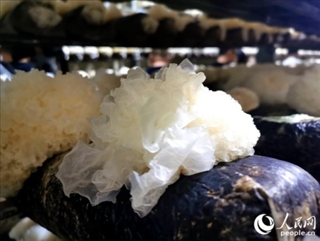 在福建省寧德市古田縣大橋鎮(zhèn)的一處標(biāo)準(zhǔn)化銀耳菇房,一個(gè)個(gè)整齊排列的架子上,培養(yǎng)基中長出一朵朵晶瑩的“白花”。由于銀耳需要避光、溫暖的生長環(huán)境,溫控智能化設(shè)備通過霧化、控溫等多項(xiàng)功能,模擬出銀耳在野生環(huán)境的生長條件。