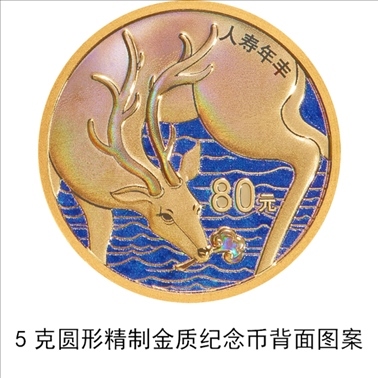 背面圖案方面,5克圓形金質(zhì)“人壽年豐”紀(jì)念幣背面圖案為鹿、靈芝、水紋等裝飾組合圖案,并刊“人壽年豐”字樣及面額。