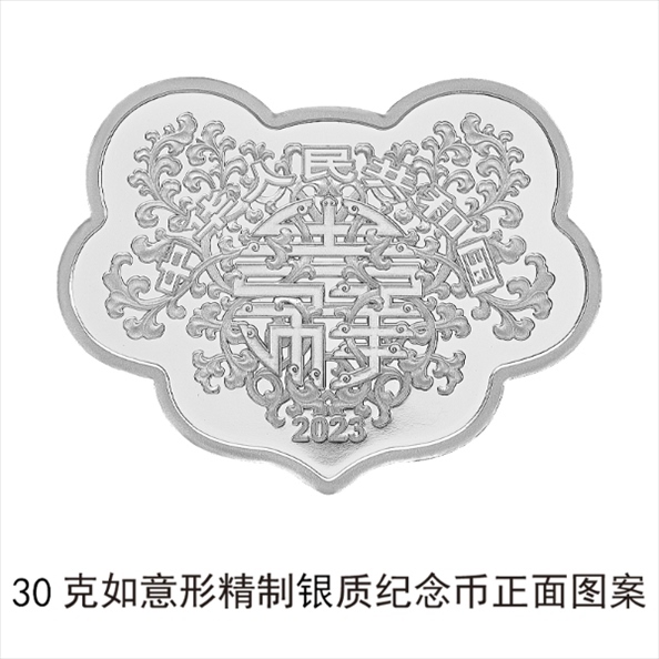 30克如意形銀質(zhì)紀(jì)念幣為精制幣,含純銀30克,外接矩形36毫米×47毫米,面額10元,成色99.9%,最大發(fā)行量20000枚。