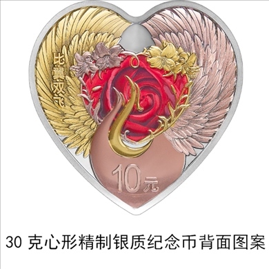 30克心形銀質(zhì)“比翼雙飛”紀(jì)念幣背面圖案為雙鳥(niǎo)、玫瑰、百合等裝飾組合圖案,并刊“比翼雙飛”字樣及面額。