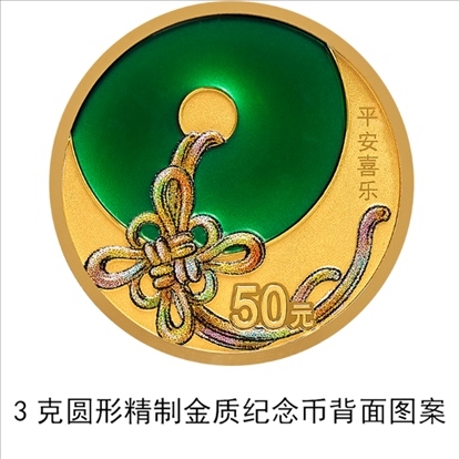 3克圓形金質(zhì)“平安喜樂(lè)”紀(jì)念幣背面圖案為平安扣、中國(guó)結(jié)裝飾組合圖案,并刊“平安喜樂(lè)”字樣及面額。