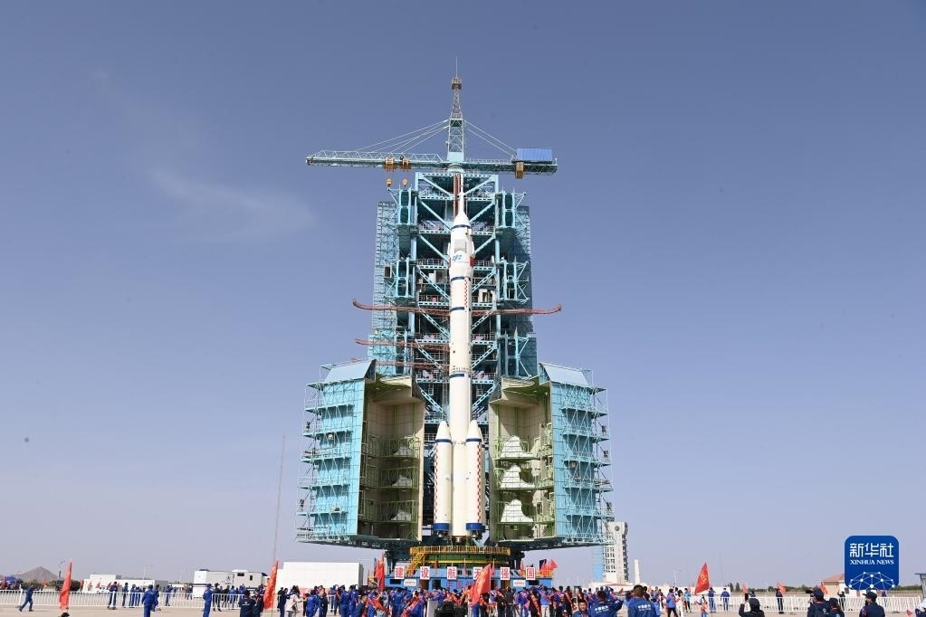 5月22日,神舟十六號載人飛船與長征二號F遙十六運載火箭組合體轉(zhuǎn)運至發(fā)射塔架。新華社發(fā)(汪江波 攝)