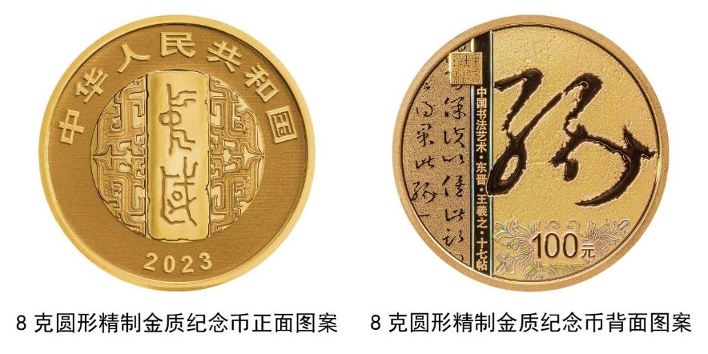 8克圓形金質(zhì)紀(jì)念幣背面圖案為東晉王羲之書(shū)《十七帖》局部文字及“緣”字樣與裝飾紋樣、“中國(guó)書(shū)法藝術(shù)”篆刻鈐印等組合設(shè)計(jì),并刊“中國(guó)書(shū)法藝術(shù)·東晉·王羲之·十七帖”字樣及面額。