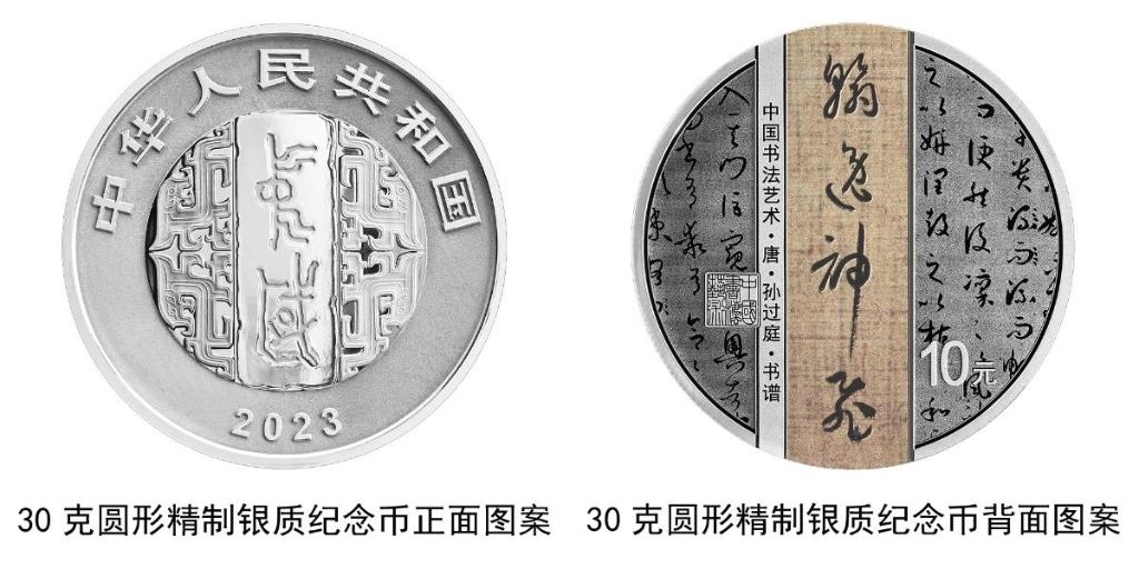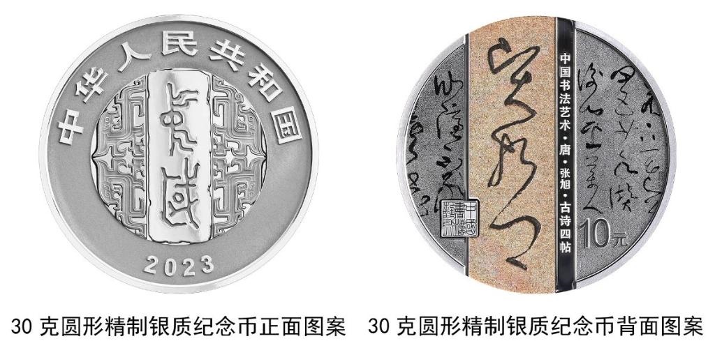 30克圓形銀質(zhì)紀(jì)念幣背面圖案為唐代張旭書(shū)《古詩(shī)四帖》局部文字及“賢哲”字樣與“中國(guó)書(shū)法藝術(shù)”篆刻鈐印等組合設(shè)計(jì),并刊“中國(guó)書(shū)法藝術(shù)·唐·張旭·古詩(shī)四帖”字樣及面額。