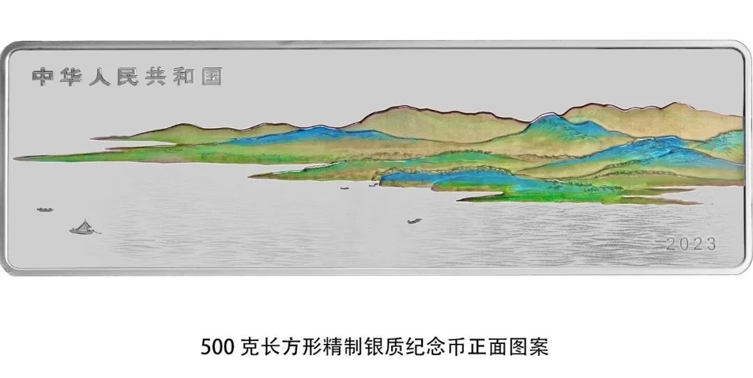 500克長(zhǎng)方形銀質(zhì)紀(jì)念幣正面圖案為山、水等組合設(shè)計(jì),并刊國(guó)名、年號(hào)。