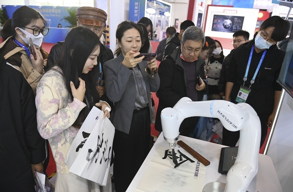 參觀者在首屆中國(guó)國(guó)際供應(yīng)鏈促進(jìn)博覽會(huì)數(shù)字科技鏈展區(qū)科大訊飛展位觀看一款A(yù)I書法機(jī)器人寫毛筆字(2023年12月2日攝)。新華社記者 蔡湘鑫 攝