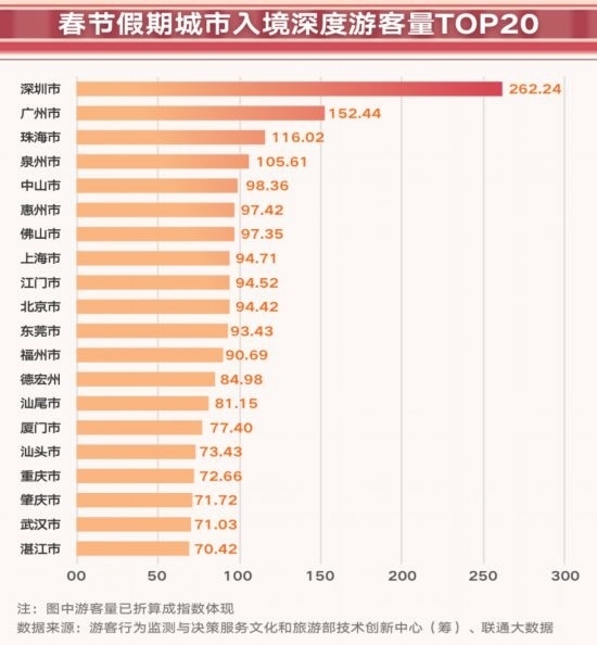珠三角城市接待入境游客量高。春節(jié)假期,入境游客大數(shù)據(jù)樣本顯示,入境深度游客量前3的城市均為珠三角城市,珠三角9個(gè)城市均位列入境游深度游客量前20,珠三角城市入境深度游客量達(dá)到抽樣總體樣本的三分之一以上。