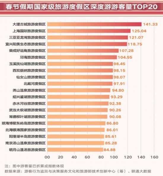春節(jié)假期,全國(guó)63家國(guó)家級(jí)旅游度假區(qū)共接待深度游客(在度假區(qū)停留2小時(shí)以上的游客人數(shù),本部分以下簡(jiǎn)稱“深度游”)793.4萬(wàn)人,按可比口徑較2023年增長(zhǎng)了42.3%,增長(zhǎng)顯著。其中深度游前20的度假區(qū)共接待478.5萬(wàn)人。