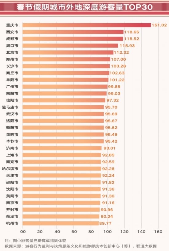 熱點(diǎn)城市假期依舊火爆。熱點(diǎn)城市在春節(jié)假期依舊是旅游市場(chǎng)的贏家,重慶、西安、成都、北京、鄭州位列外地深度游前5位,長(zhǎng)沙、廣州、武漢、濟(jì)南、上海進(jìn)入了外地深度游前20位。
