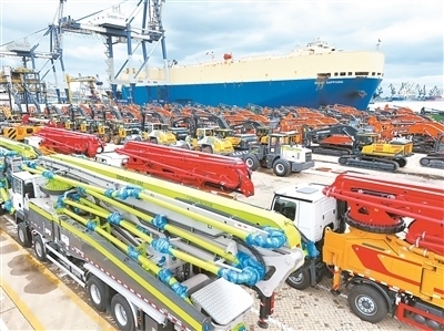10月14日,國(guó)產(chǎn)工程機(jī)械在山東港口煙臺(tái)港集結(jié)等待裝船出口。唐 克攝(人民視覺(jué))