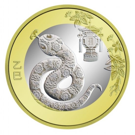 背面圖案方面,雙色銅合金紀念幣背面圖案為中國傳統(tǒng)剪紙藝術(shù)與裝飾年畫元素相結(jié)合的蛇形象,襯以花燈和人參圖案,幣面左側(cè)刊“乙巳”字樣。