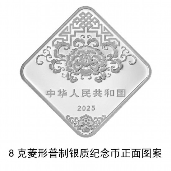 8克菱形銀質(zhì)紀念幣背面圖案為貼“?!弊謭鼍埃⒖骖~。