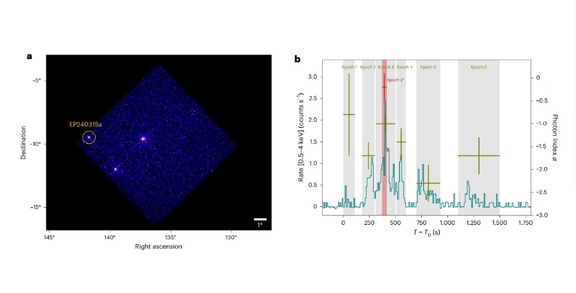 此后,世界各地多個天文望遠鏡陸續(xù)觀測到EP240315a。研究結果表明,EP240315a產生于遙遠的早期宇宙,當時宇宙年齡僅為現(xiàn)在的10%,EP240315a的信號花費了125億年才抵達地球。