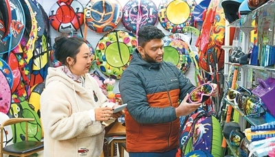 浙江義烏國際商貿(mào)城一家戶外滑雪用具店鋪內(nèi),外商在洽談、選購戶外冰雪運(yùn)動裝備。