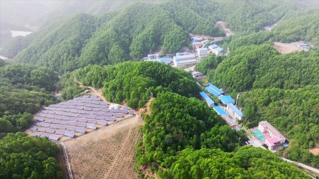 驅(qū)車(chē)駛?cè)肼鍖幙h伏牛山區(qū),在紫金礦業(yè)集團(tuán)旗下的洛陽(yáng)坤宇礦業(yè)有限公司,已閉庫(kù)的尾礦庫(kù)上,光伏電板依山勢(shì)整齊排列,深藍(lán)色的面板與周邊翠綠的樹(shù)木交相輝映,科技感十足。