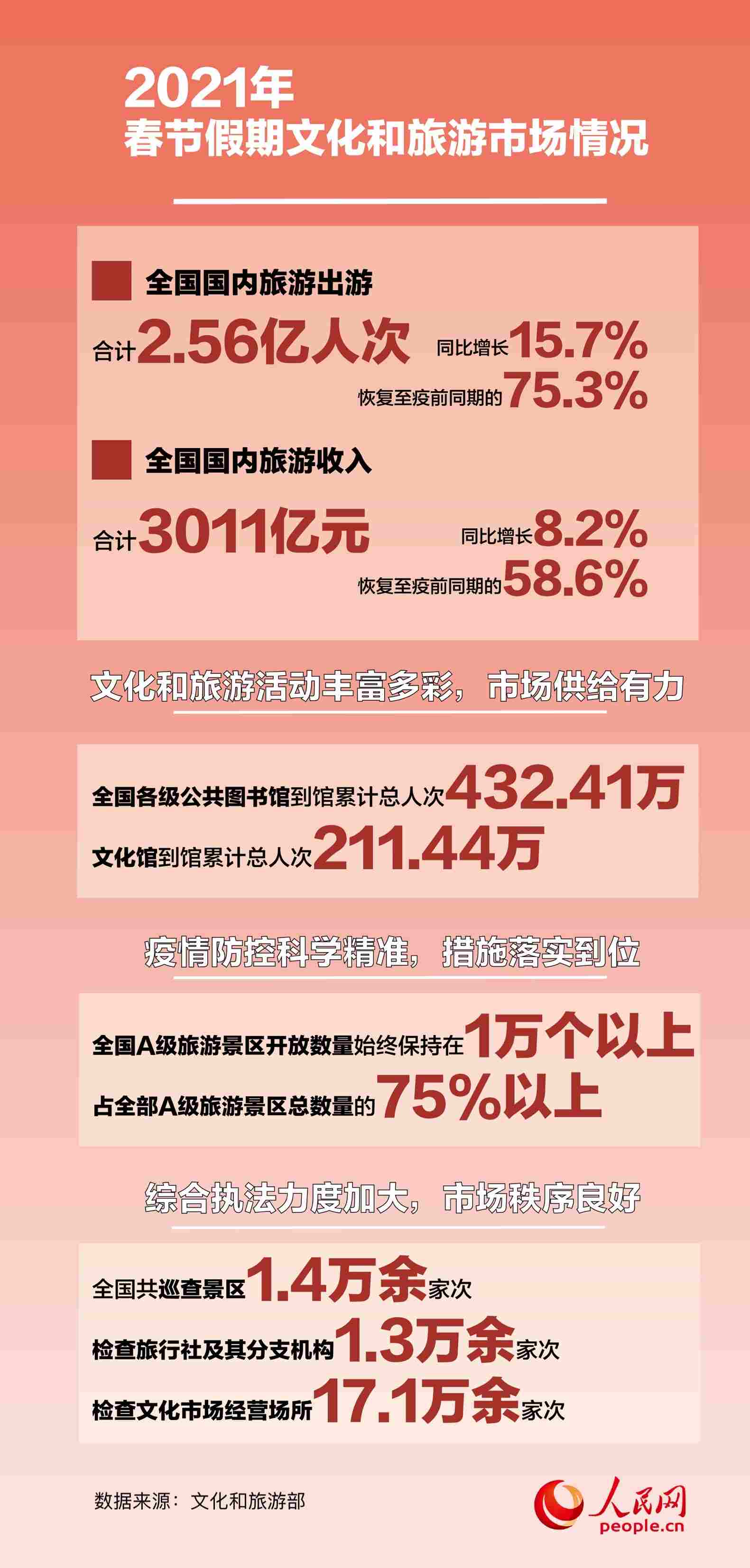 人民網(wǎng)北京2月25日電 (白帆)2月25日,文化和旅游部發(fā)布了2021年春節(jié)假期文化和旅游市場情況。數(shù)據(jù)顯示,綜合各地文化和旅游部門、通訊運營商、線上旅行服務(wù)商的數(shù)據(jù),經(jīng)文化和旅游部數(shù)據(jù)中心測算,春節(jié)假期七天,全國國內(nèi)旅游出游合計2.56億人次,同比增長15.7%,恢復(fù)至疫前同期的75.3%。實現(xiàn)國內(nèi)旅游收入3011億元,同比增長8.2%,恢復(fù)至疫前同期的58.6%。