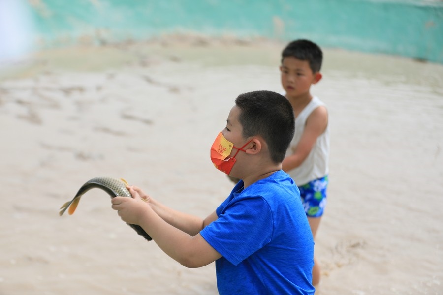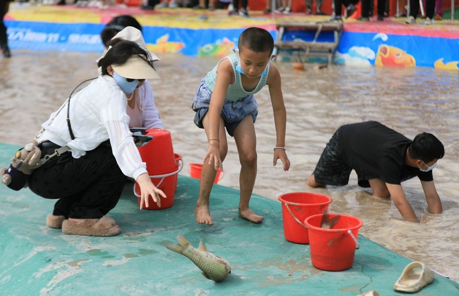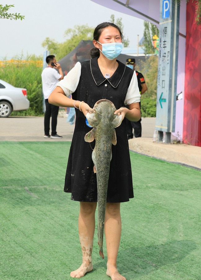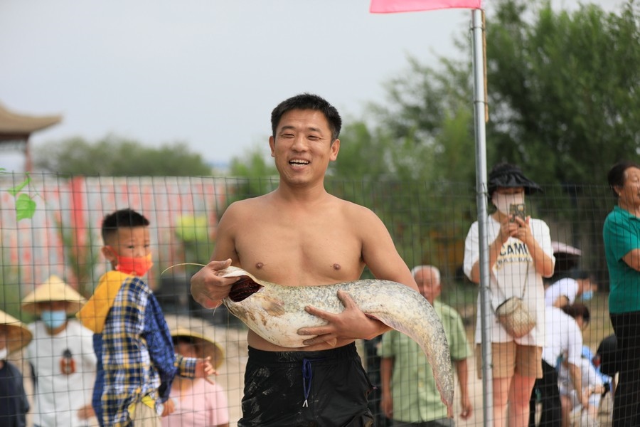 “抓到了,好大一條!”一位男士從池塘中抓到了一條1米多長的大魚,旁邊眾多參與者紛紛投來羨慕的目光。