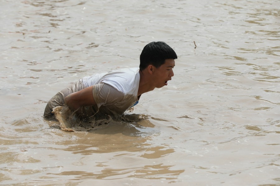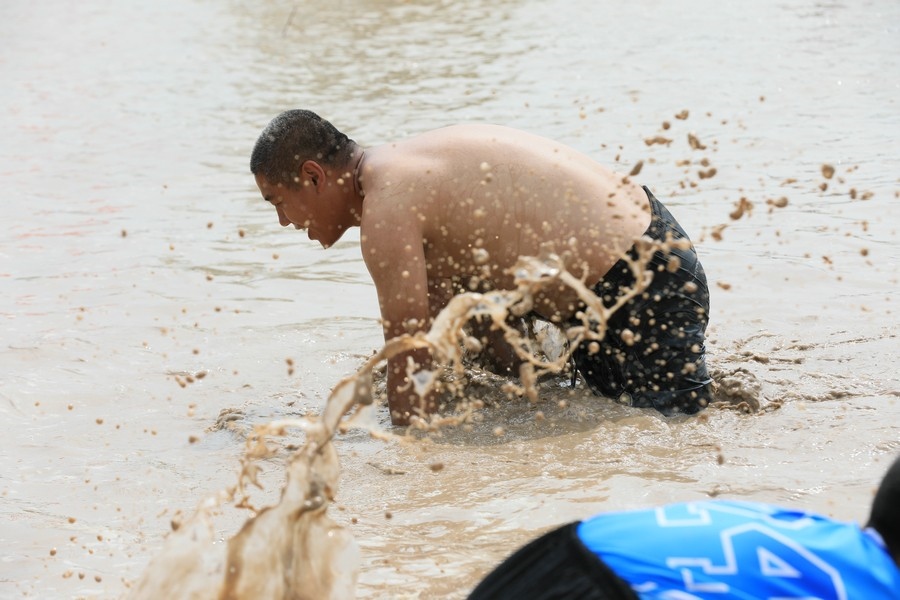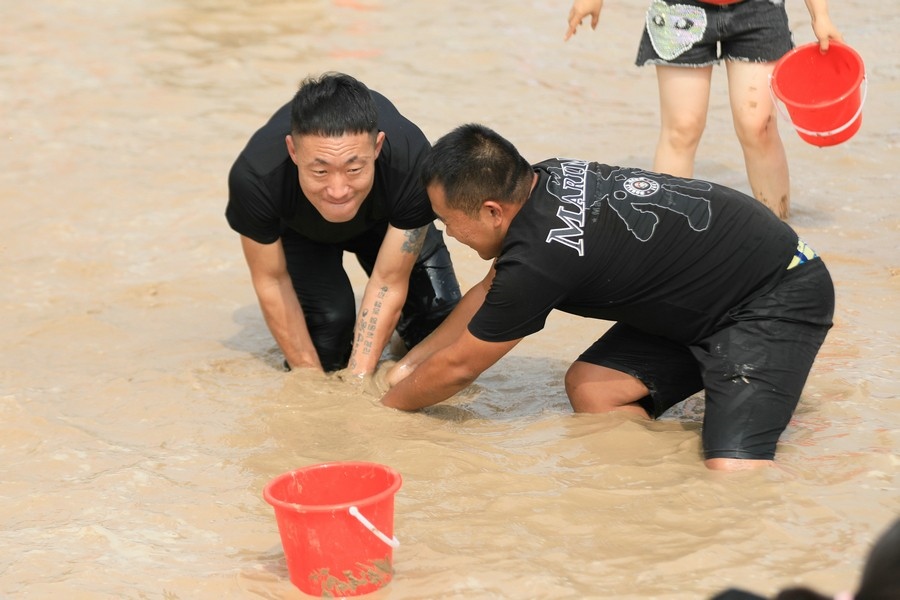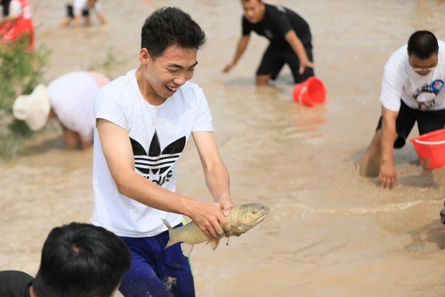 隨著主持人的一聲號(hào)令,來自呼和浩特市區(qū)和土默特左旗的眾多參與者,挽起褲管,光著腳丫,沖進(jìn)池塘,展開了一場(chǎng)摸魚大比拼。