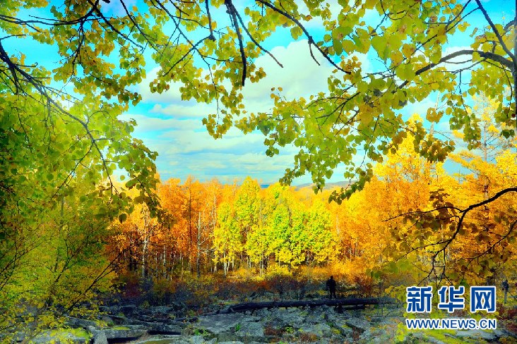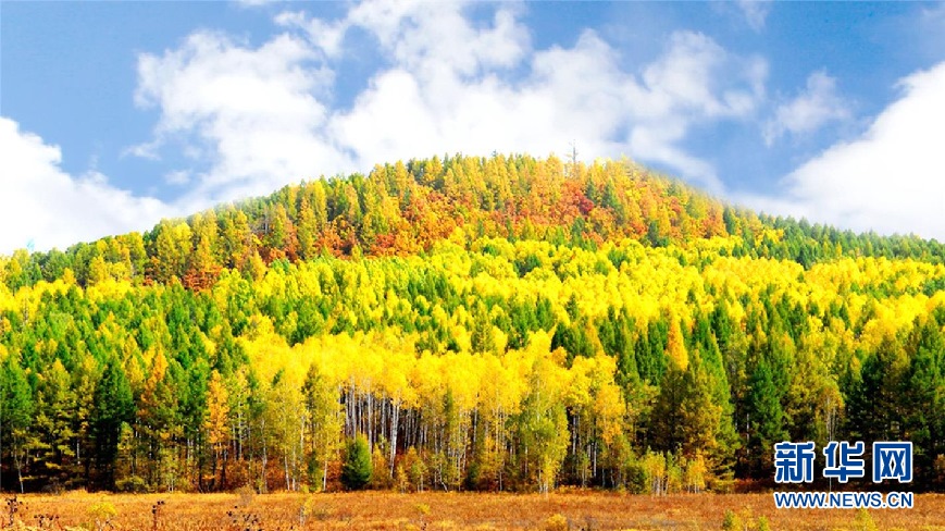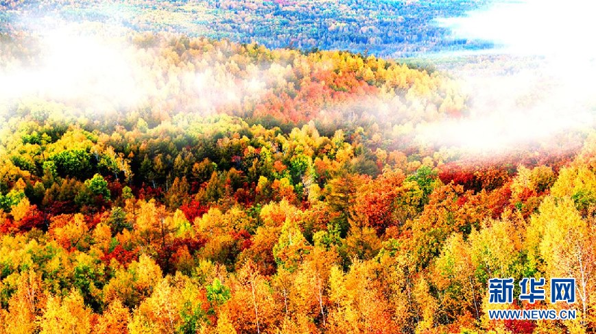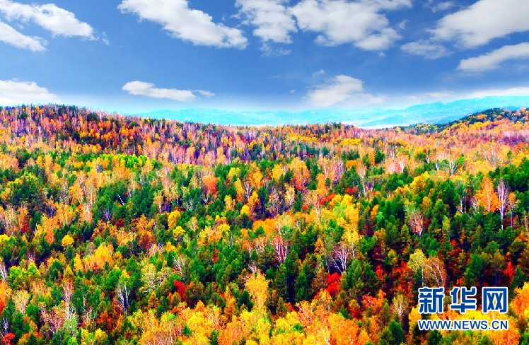 松樹林、白樺林、柞樹林和一片片混交林“染”成不同色彩,茫茫林海宛若一幅匠心獨運的繽紛畫卷。(9月28日攝)新華網發(fā)(欒維敬 攝)