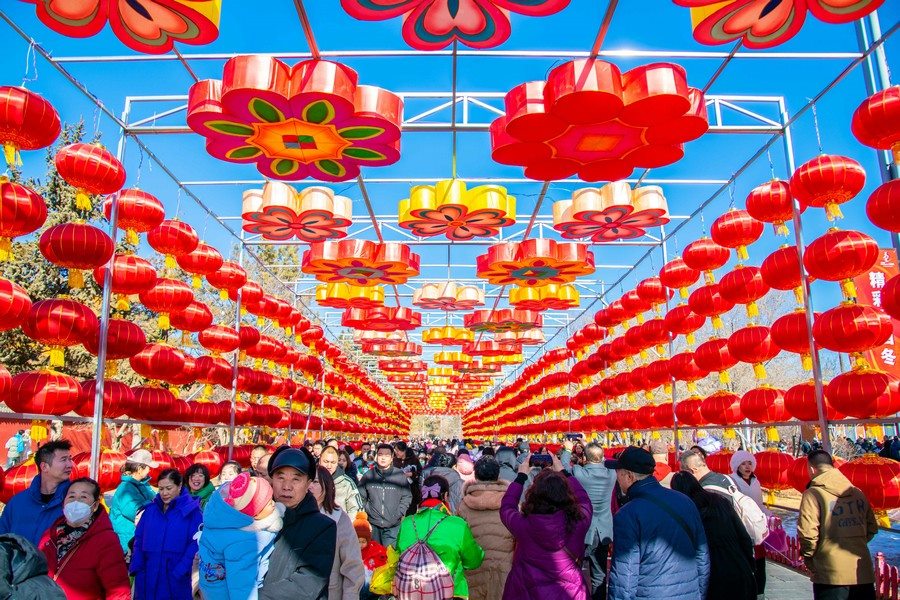 2024年2月15日,人們在呼和浩特市玉泉區(qū)塞上老街旅游休閑街區(qū)燈籠長廊內(nèi)游玩。丁根厚 攝