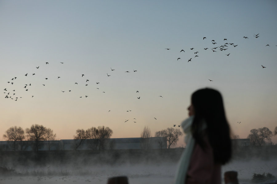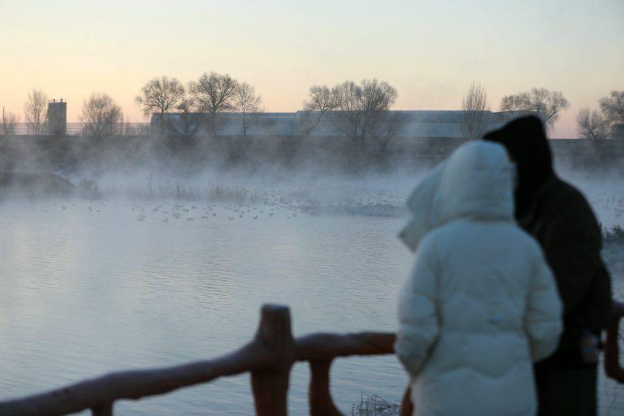12月15日清晨,上千名游人在呼和浩特玉泉區(qū)班定營(yíng)村南側(cè)的塞外“千島湖”畔賞景打卡。此處湖水為城市污水經(jīng)處理達(dá)標(biāo)后的再生水,隆冬時(shí)節(jié),再生水流入湖中,水汽蒸騰,岸邊草木霧凇皚皚,良好的生態(tài)吸引了數(shù)萬只赤麻鴨在此翔集棲息,構(gòu)成一幅生動(dòng)和諧的美麗畫面。每日清晨,都有上千名游客來此觀日出賞美景。