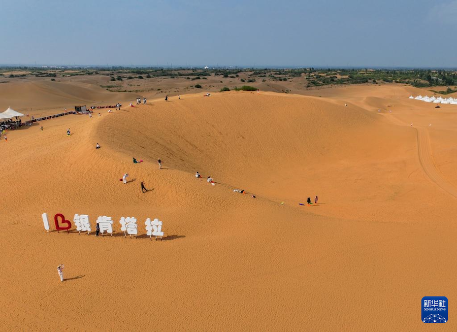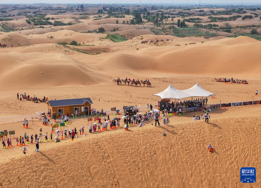 盛夏時(shí)節(jié),內(nèi)蒙古鄂爾多斯市庫布其沙漠迎來旅游旺季。在達(dá)拉特旗銀肯塔拉和響沙灣景區(qū),來自各地的游客絡(luò)繹不絕。
