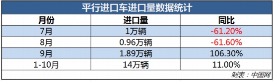 除了新能源汽車進口量增長,平行進口車也成為了一大亮點。根據(jù)數(shù)據(jù)顯示,今年7、8月份,我國平行進口車在進口車市場中成績還屬較差。其中,7月份平行進口車進口量約為1萬輛,同比下滑了61.2%;8月份平行進口車進口量也不理想,僅有9600輛,同比下滑了61.6%。但就在9月份,平行進口車數(shù)量則出現(xiàn)了大幅攀升。根據(jù)國機汽車數(shù)據(jù)統(tǒng)計,9月份我國平行進口汽車進口量約為1.89萬輛,同比大增106.3%。今年1-10月,平行進口車數(shù)量共14.0萬輛,同比上漲了11.0%,占進口總量的16%。詳情見下表:
