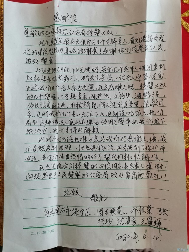 6月17日,呼和浩特市和林格爾縣公安局收到一個(gè)來自烏蘭察布市的快遞,收件人只寫著和林縣公安局,無具體部門與姓名。民警將其打開,里面竟是一面寫著“忠于職守、為民解憂”的錦旗、還有一封感謝信及一張合影照片。感謝信中寫道:此時(shí)千言萬語也難以表達(dá)我們的感激之情,我們雖然遇到困難,但也是幸運(yùn)的,因?yàn)橛龅搅四銈?,是你們伸出熱情的雙手,幫我們排憂解難……