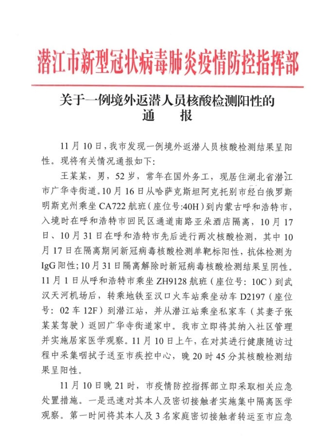 王某某,男,52歲,常年在國外務(wù)工,現(xiàn)居住湖北省潛江市廣華寺辦事處。2020年10月16日從哈薩克斯坦阿克托別市經(jīng)白俄羅斯明斯克州乘坐CA722航班(座位號:40H)到內(nèi)蒙古呼和浩特市,入境時在呼和浩特市回民區(qū)通道南路亞朵酒店隔離,10月17日、10月31日在呼和浩特先后進行兩次核酸檢測,其中10月17日在隔離期間新冠病毒核酸檢測單靶標(biāo)陽性,抗體檢測為LgG陽性;10月31日隔離解除時新冠病毒核酸檢測陰性。11月1日從呼和浩特市乘坐ZH9128航班(座位號:10C)到武漢天河機場后,轉(zhuǎn)乘地鐵至漢口火車站乘坐動車D2197(座位號:02車12F)到潛江,從潛江乘坐私家車(其妻子張某某駕駛)返回廣華家中,并落實社區(qū)管控措施。11月10日,其咽拭子送至潛江市疾控中心核酸檢測結(jié)果呈陽性。