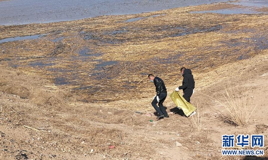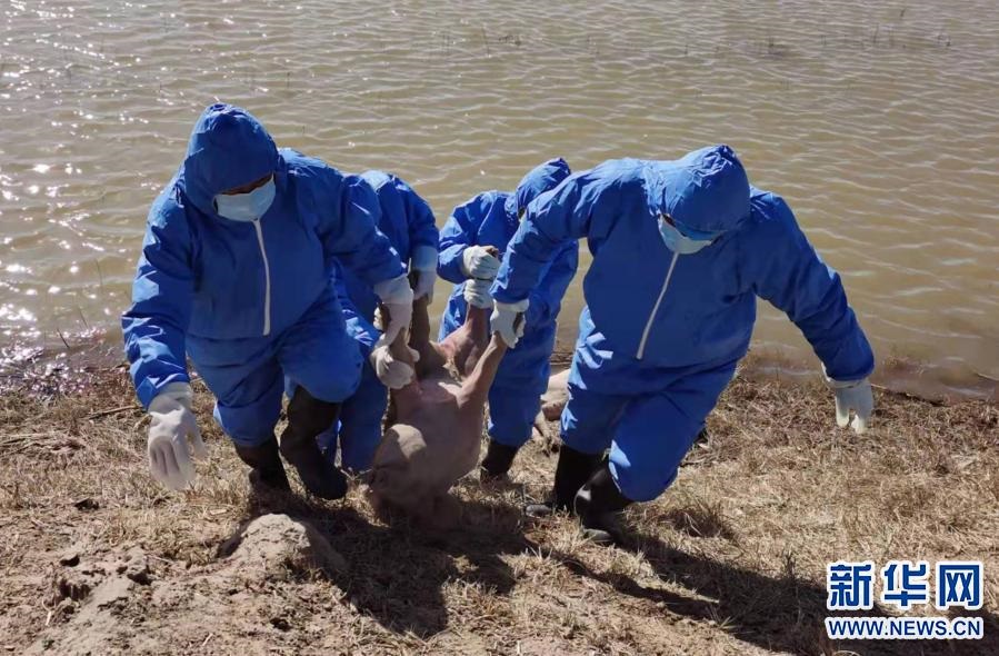 3月21日,當?shù)卣块T派出的工作人員在達拉特旗黃河國堤內(nèi)收集死畜。新華社發(fā)