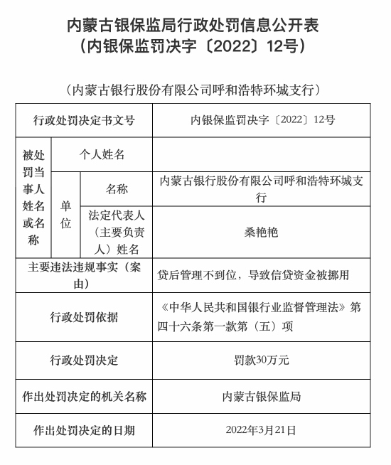 4月28日消息,據(jù)內(nèi)蒙古銀保監(jiān)局行政處罰信息公開(kāi)表顯示,內(nèi)蒙古銀行股份有限公司呼和浩特環(huán)城支行因貸后管理不到位導(dǎo)致信貸資金被挪,被罰款30萬(wàn)元。具體內(nèi)容如下: