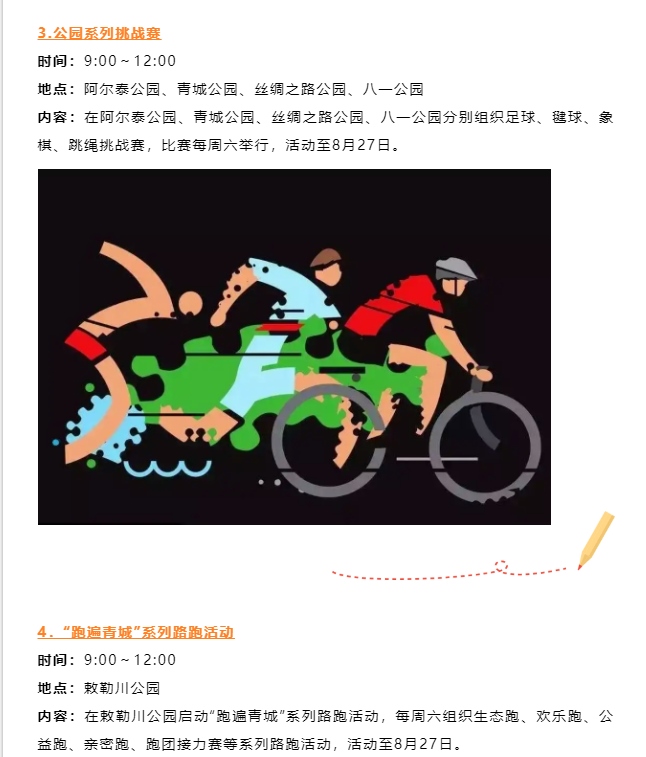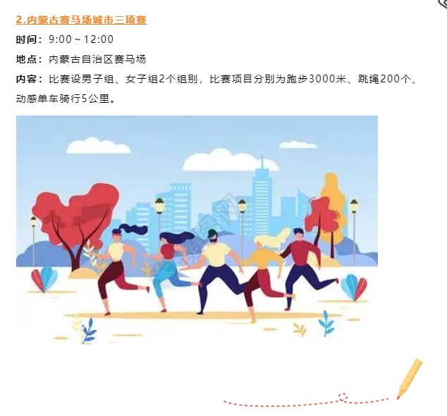 本次運(yùn)動(dòng)會(huì)認(rèn)真踐行“以人民為中心”辦賽理念,創(chuàng)新探索聚集少、規(guī)模小、符合大眾運(yùn)動(dòng)口味的內(nèi)蒙古賽馬場城市三項(xiàng)賽,包含跑步3000米、跳繩200個(gè)和動(dòng)感單車騎行5公里3個(gè)項(xiàng)目比賽。此外,還將舉辦公園系列挑戰(zhàn)賽、“跑遍青城”系列路跑活動(dòng)等,讓群眾在暢享運(yùn)動(dòng)的過程中盡情領(lǐng)略城市綠景的清新曼妙,進(jìn)一步推動(dòng)全民健身與全民健康深度融合。
