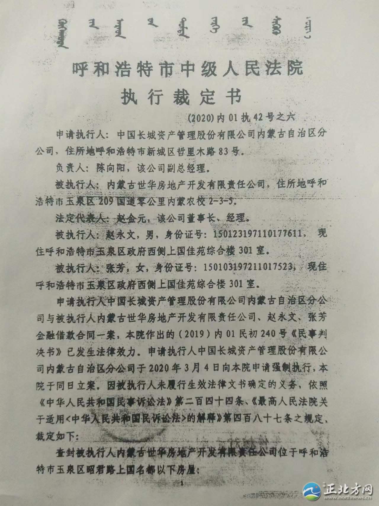 記者從上國名都部分業(yè)主提供的法院執(zhí)行裁定書上了解到,僅中國長(zhǎng)城資產(chǎn)管理股份有限公司內(nèi)蒙古自治區(qū)分公司一家申請(qǐng)執(zhí)行人就申請(qǐng)法院查封了上國名都住宅樓80多套房產(chǎn)。其他債權(quán)人又通過多家法院查封了上國名都小區(qū)60多套住宅。目前,上國名都216套住宅有140多套被查封。