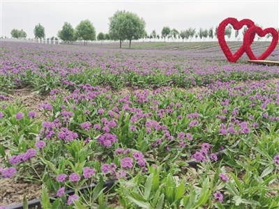 8月23日,記者來到馬鞭草花海,遠遠望去,遍野的紫色在視線中彌漫開來,叫人情不自禁奔向花海。微風拂過,花枝搖曳,心形造型、大風車、馬頭琴等景觀小品點綴其間,給花海增添了一份浪漫情調。人們沿著