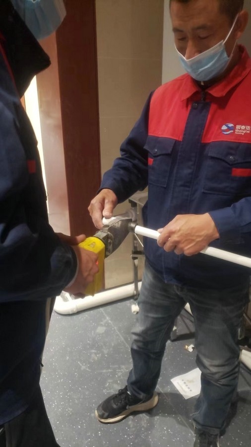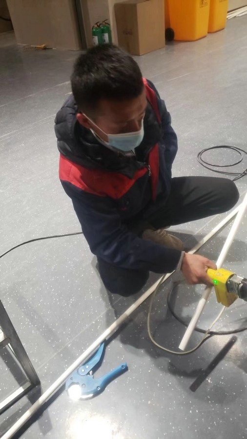 深夜,氣溫突降,冷風(fēng)毫不留情地灌入現(xiàn)場施工人員的衣服里,但無一人松勁、無一人退縮。由于材料分布范圍較大,只見身穿紅、藍(lán)工作服的他們徒步穿梭于各樓層之間,一刻不停地搬運管件及材料、安裝設(shè)備。因疫情管控不能到現(xiàn)場的同事則堅持利用通訊工具提供遠(yuǎn)程技術(shù)支持,為前線答疑解惑。方艙醫(yī)院建設(shè)屬于應(yīng)急工程,時間緊、任務(wù)重,加之現(xiàn)場材料缺乏,施工人員只能就地取材,爭分奪秒的同時,“突擊隊”表現(xiàn)出了高度的專業(yè)性,迅速、細(xì)致、高效地進(jìn)行管道鋪設(shè)和熱水器安裝……凌晨4點,在現(xiàn)場全體施工人員的共同努力下,方艙醫(yī)院水暖安裝工作順利完成。