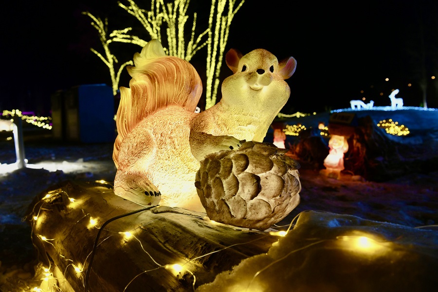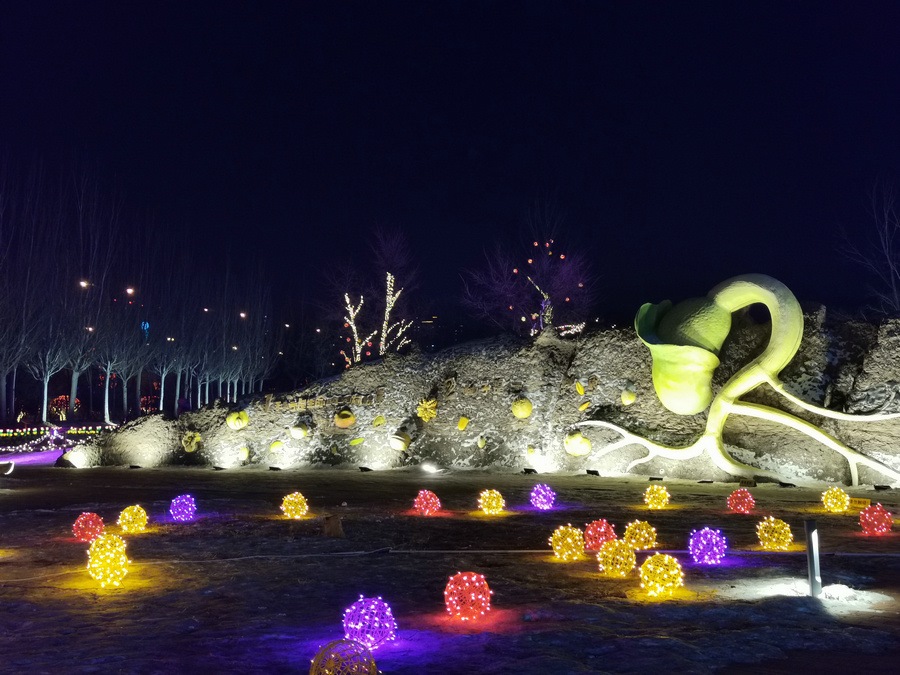 串燈、月球燈、抱樹燈、地插花、氣球燈點綴,搭配動物造型燈,整個小草公園生機勃勃?!翱茨沁呥€有雪人”,小朋友的歡呼聲打破了夜晚的寂靜。