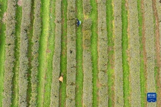 2月17日,茶農(nóng)在湖北省丹江口市土關(guān)埡村武當茶谷勞作(無人機照片)。