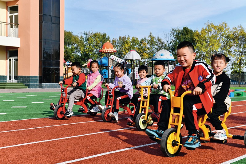 在山東省東營市墾利區(qū)楊廟社區(qū)幼兒園,孩子們?cè)诶蠋煹膸ьI(lǐng)下進(jìn)行戶外活動(dòng)(2021年10月19日攝) 郭緒雷攝