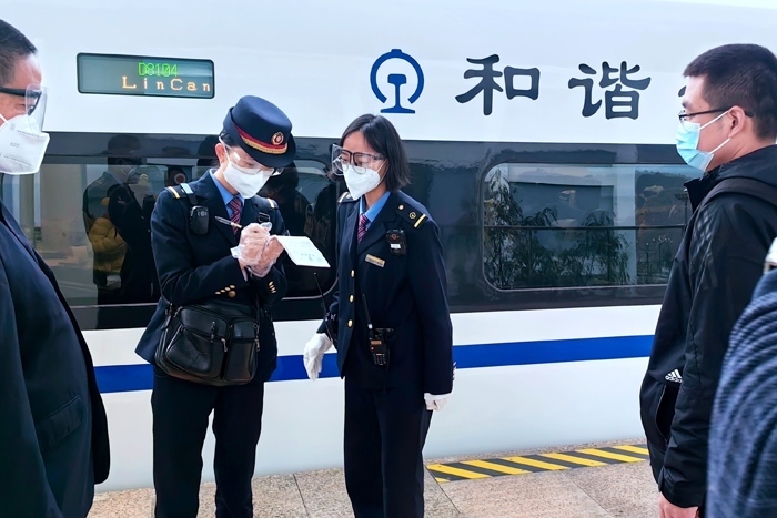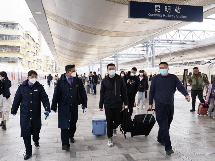 云縣站工作人員引導(dǎo)醫(yī)務(wù)人員進(jìn)入站臺(tái)乘坐動(dòng)車(chē)。中國(guó)鐵路昆明局集團(tuán)有限公司供圖