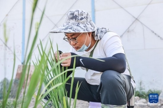 2月22日,青島海水稻研究發(fā)展中心的科研人員在海南三亞的國(guó)家南繁科研育種基地里做水稻雜交實(shí)驗(yàn)。