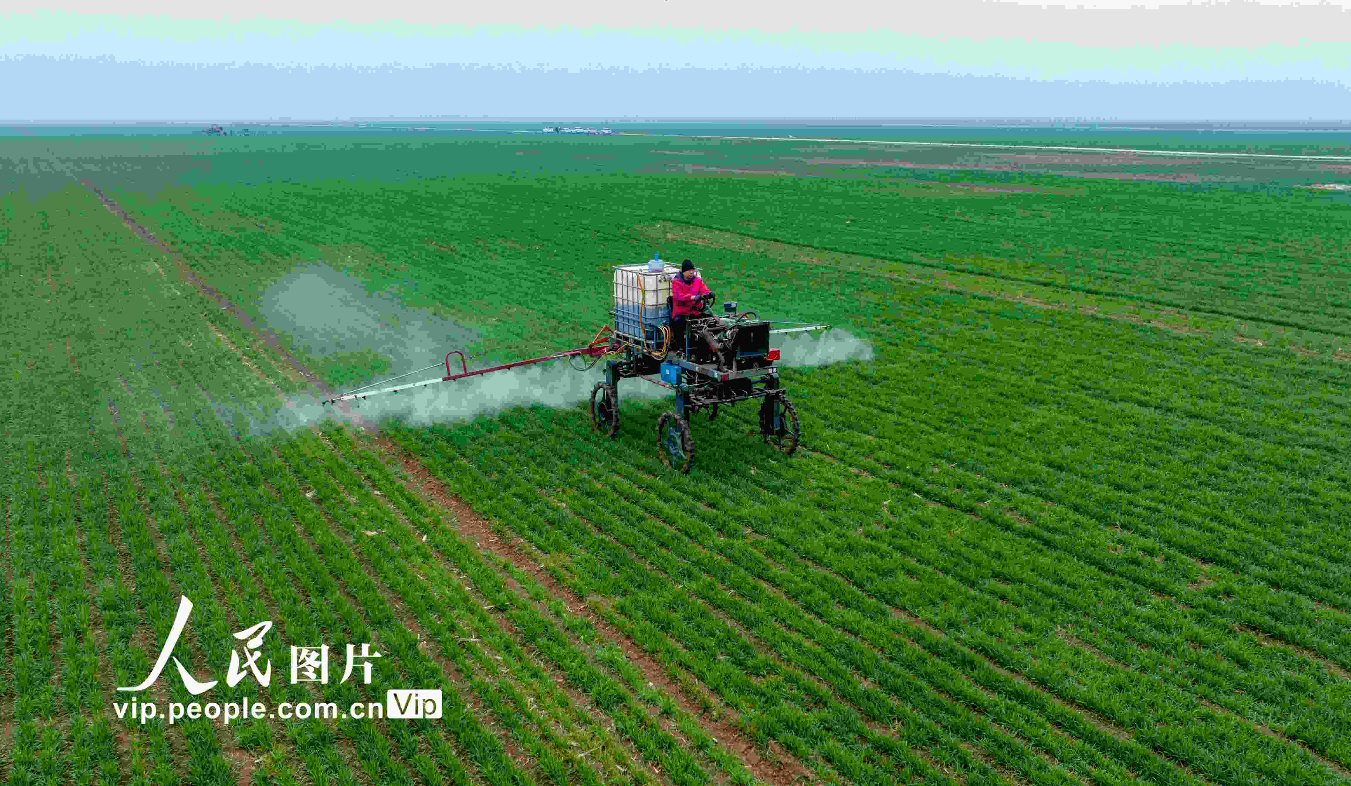 2023年2月25日,河南省駐馬店市西平縣老王坡高標(biāo)準(zhǔn)農(nóng)田,農(nóng)民正在駕駛農(nóng)機設(shè)備噴灑農(nóng)藥。趙永濤攝(人民圖片網(wǎng))