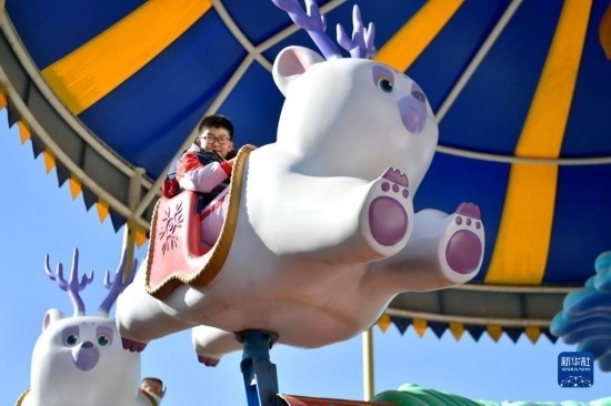 3月3日,在嘉峪關(guān)方特絲路神畫(huà)景區(qū),小游客乘坐游樂(lè)設(shè)施。